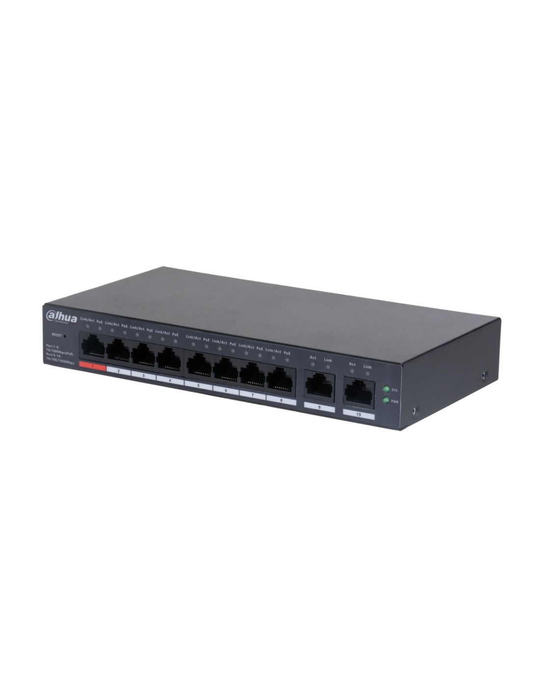 Dahua Technology DH-CS4010-8ET-110. Switch type: Managed, Switch layer: L2. Basic switching RJ-45 Ethernet ports type: Fast Ethernet (10/100), Basic switching RJ-45 Ethernet ports quantity: 8. MAC address table: 8000 entries, Switching capacity: 5.6 Gbit/s. Networking standards: IEEE 802.3, IEEE 802.3ab, IEEE 802.3af, IEEE 802.3at, IEEE 802.3bt, IEEE 802.3u, IEEE 802.3x. DC input voltage: 54 V. Power over Ethernet (PoE)