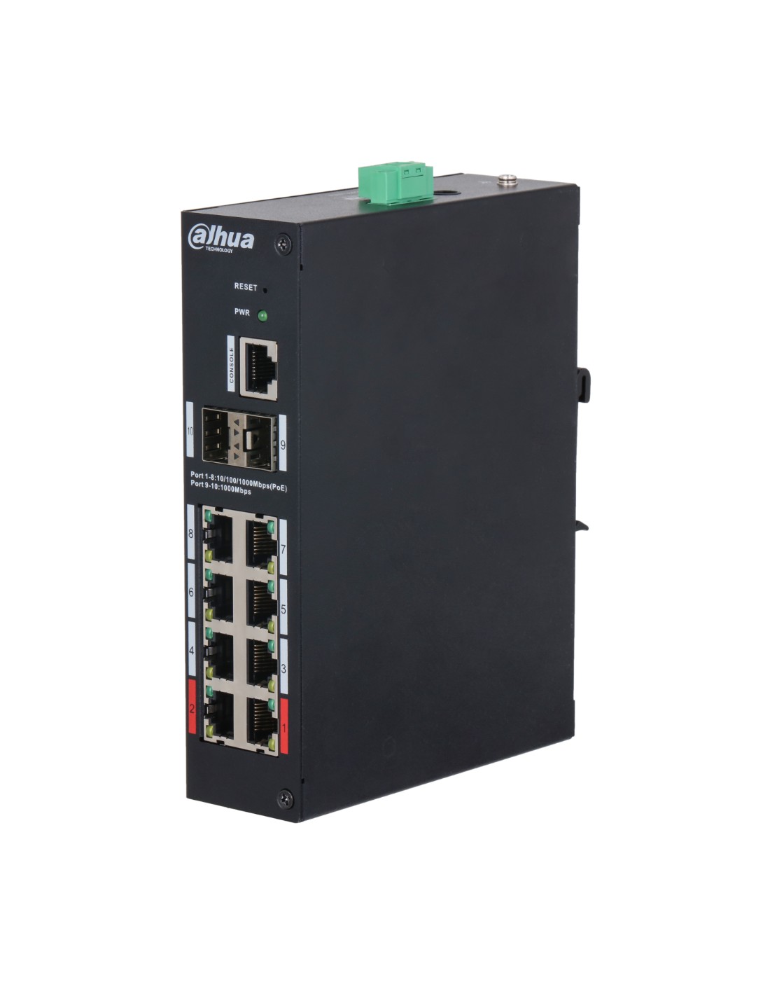 Switch Hardened PoE 8 puertos Gigabit +2SFP Gigabit 110W Gestionable Layer2 [HS4210-8GT-110] Switch Hardened PoE 8 puertos Gigabit +2SFP Gigabit 110W Gestionable Layer2 - Switch Hardened PoE capa 2, de 8 puertos.- Soporta estándar IEEE802.3af, IEEE802.3at, Hi-PoE, IEEE802.3bt.- Cumple con IEEE802.3, IEEE802.3u, IEEE802.3x, IEEE802.3ab.- PoE Watchdog, monitorea en tiempo real el estado del dispositivo.- Puertos 1-8: 8xRJ45 10/100/1000Mbps (PoE).- Puertos 9-10: 2xSFP 1000Mbps (Uplink).- Puertos 1-2 ?90W, Puertos 3-8 ?30W, total ?110W.- BT 90W (Puerto rojo) => Los puertos rojos son compatibles con los estándares IEEE802.3af, IEEE802.3at, IEEE802.3bt y HiPoE, con un consumo máximo de potencia de salida de 90W por puerto. Adecuados para alimentar dispositivos de alta potencia.- PoE Extendido (250m) NO compatible con las Series IPC1 e IPC2 de DAHUA. Consultar para otros fabricantes.- Consumo de energía: En reposo: 5W / Carga completa: 120W.- Temperatura de trabajo: -30°C ~ +65°C.- Dimensiones y peso: 162x123.5x42mm / 0.63Kg.*Alimentador incluido. https://www.ibdglobal.com/shop/hs4210-8gt-110-switch-hardened-poe-8-puertos-gigabit-2sfp-gigabit-110w-gestionable-layer2-20394 https://www.ibdglobal.com/web/image/product.template/20394/image_1920?unique=5d6c7ba SKU: HS4210-8GT-110 Dahua This combination does not exist. Add to compare ??Términos y condiciones?? Garantía de devolución de 30 días Envío: 2-3 días laborales Product downloads Technical Sheet HS4210-8GT-110 - Ficha Técnica Dahua HS42xx-xxx-xxx - Certificado CE
