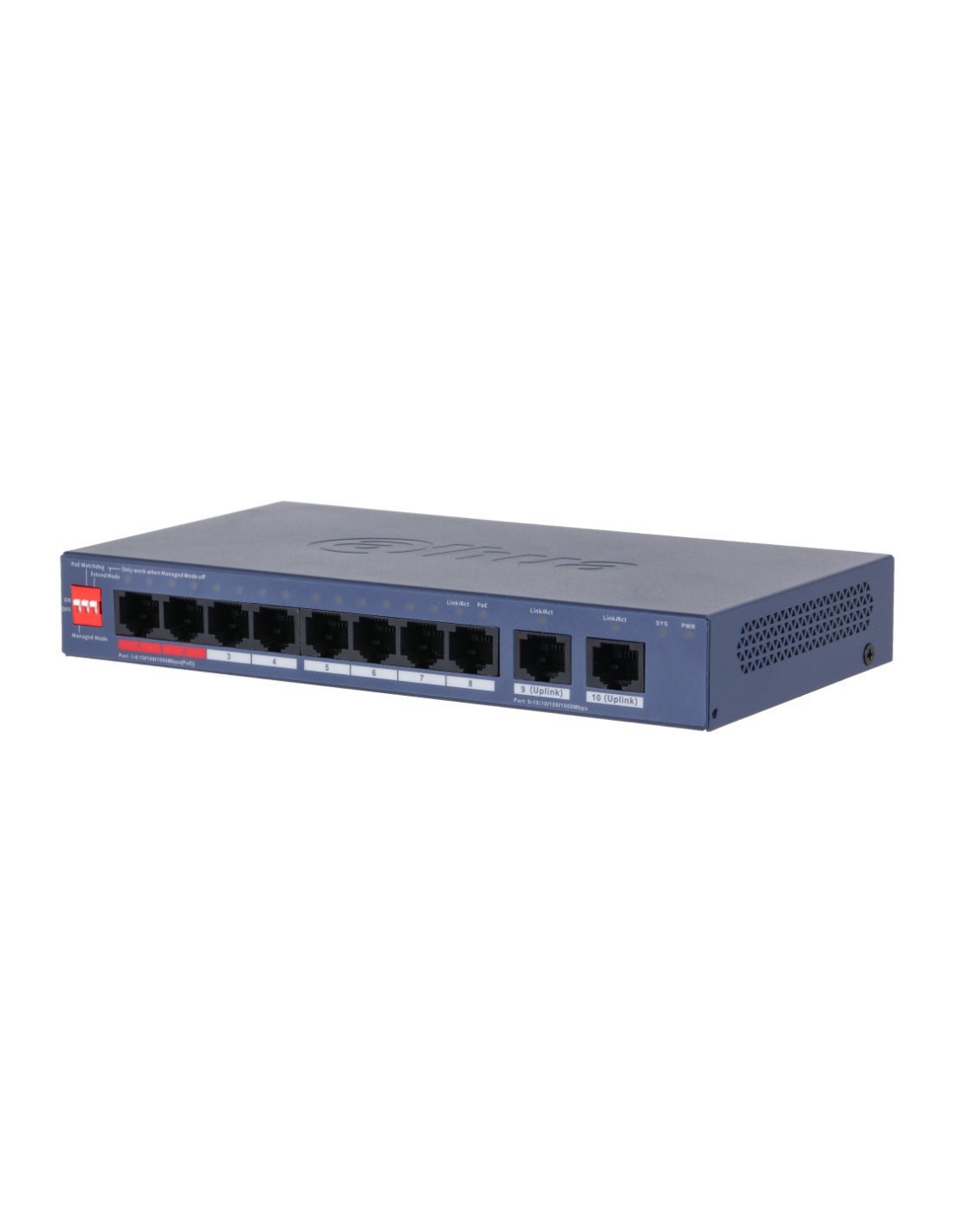 Switch PoE 8 puertos Gigabit + 2RJ45 Uplink Gigabit 110W Gestionable en Cloud Layer2 [CS4010-8GT-110-V2] Switch PoE 8 puertos Gigabit + 2RJ45 Uplink Gigabit 110W Gestionable en Cloud Layer2 - Switch PoE capa 2.- Soporta estándar IEEE802.3af, IEEE802.3at, Hi-PoE, IEEE802.3bt.- Cumple con IEEE802.3, IEEE802.3u, IEEE802.3x, IEEE802.3ab, IEEE802.3az, IEEE802.3ad.- PoE Watchdog, monitorea en tiempo real el estado del dispositivo.- 1 botón de reinicio.- Puertos 1-8: 8xRJ45 10/100/1000Mbps (PoE).- Puertos 9-10: 2xRJ45 10/100/1000Mbps (Uplink).- Puertos 1-2 ?90W, Puertos 3-8 ?30W, total ?110W.- BT 90W (Puerto rojo) => Los puertos rojos son compatibles con los estándares IEEE802.3af, IEEE802.3at, IEEE802.3bt y HiPoE, con un consumo máximo de potencia de salida de 90W por puerto. Adecuados para alimentar dispositivos de alta potencia.- Consumo de energía: En reposo: 5.7W / Carga completa: 115W.- Temperatura de trabajo: -10°C ~ +55°C.- Cloud Management: Gestión en la nube a través de la aplicación DoLynk Care.- Dimensiones y peso: 184.6x103.3x27mm / 0.36Kg. https://www.ibdglobal.com/shop/cs4010-8gt-110-v2-switch-poe-8-puertos-gigabit-2rj45-uplink-gigabit-110w-gestionable-en-cloud-layer2-21866 https://www.ibdglobal.com/web/image/product.template/21866/image_1920?unique=278373b SKU: CS4010-8GT-110-V2 Dahua This combination does not exist. Add to compare ??Términos y condiciones?? Garantía de devolución de 30 días Envío: 2-3 días laborales Product downloads Technical Sheet xS4xxx-xxTxxx-xx - Certificado CE CS4010-8GT-110-V2 - Ficha Técnica Dahua