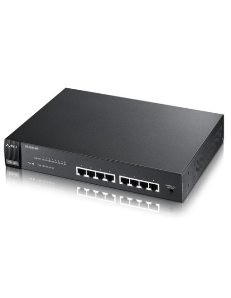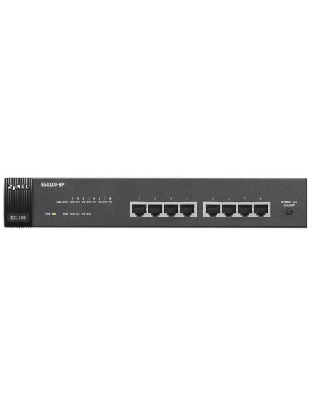 Zyxel ES1100. Tipo de interruptor: No administrado. Cantidad de puertos básicos de conmutación RJ-45 Ethernet: 8. Bidireccional completo (Full duplex). Tabla de direcciones MAC: 1024 entradas, Capacidad de conmutación: 1,6 Gbit/s. Estándares de red: IEEE 802.1p,IEEE 802.3af,IEEE 802.3x. Energía sobre Ethernet (PoE). Factor de forma: 1U, Certificado Energy Star