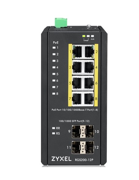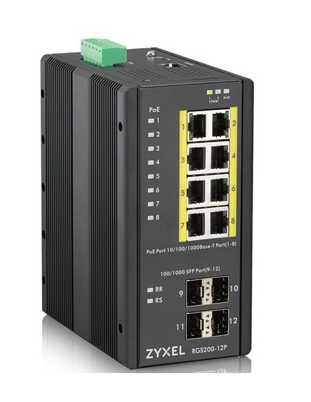 Zyxel RGS200-12P. Tipo de interruptor: Gestionado, Capa del interruptor: L2. Puertos tipo básico de conmutación RJ-45 Ethernet: Gigabit Ethernet (10/100/1000), Cantidad de puertos básicos de conmutación RJ-45 Ethernet: 8. Bidireccional completo (Full duplex). Tabla de direcciones MAC: 8000 entradas, Capacidad de conmutación: 24 Gbit/s. Estándares de red: IEEE 802.1D,IEEE 802.1Q,IEEE 802.1ab,IEEE 802.1p,IEEE 802.1s,IEEE 802.1w,IEEE 802.3,IEEE.... Voltaje de entrada DC: 12 - 58 V. Energía sobre Ethernet (PoE). Montaje de pared, Montaje en rack