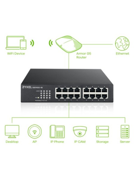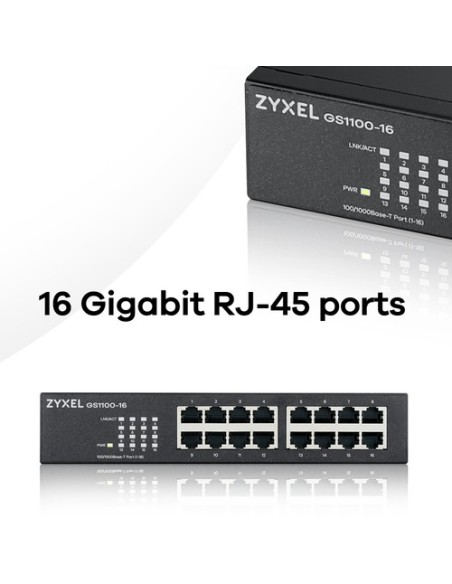 Zyxel GS1100-16. Tipo de interruptor: No administrado. Puertos tipo básico de conmutación RJ-45 Ethernet: Gigabit Ethernet (10/100/1000), Cantidad de puertos básicos de conmutación RJ-45 Ethernet: 16. Tabla de direcciones MAC: 8000 entradas, Capacidad de conmutación: 32 Gbit/s. Estándares de red: IEEE 802.1p,IEEE 802.3,IEEE 802.3ab,IEEE 802.3az,IEEE 802.3u,IEEE 802.3x,IEEE 802.3z. Montaje de pared, Montaje en rack