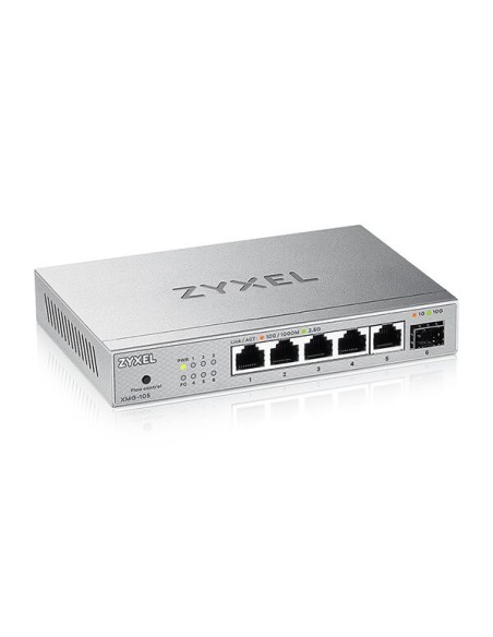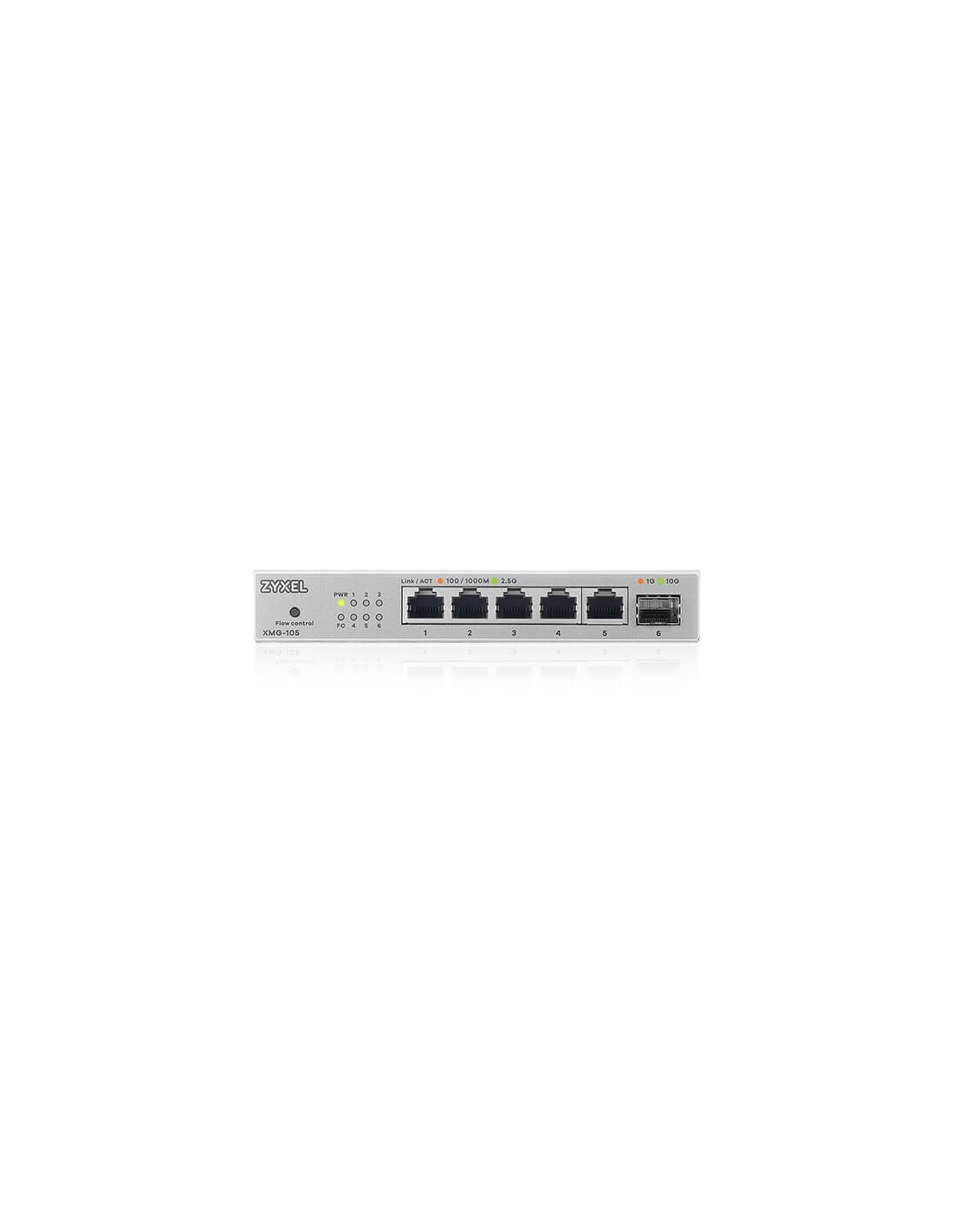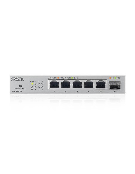 Zyxel XMG-105. Tipo de interruptor: No administrado. Puertos tipo básico de conmutación RJ-45 Ethernet: 2.5G Ethernet (100/1000/2500), Cantidad de puertos básicos de conmutación RJ-45 Ethernet: 5. Tabla de direcciones MAC: 16000 entradas, Capacidad de conmutación: 25 Gbit/s. Estándares de red: IEEE 802.1p, IEEE 802.3, IEEE 802.3ab, IEEE 802.3bz, IEEE 802.3u, IEEE 802.3x